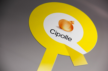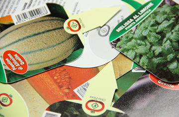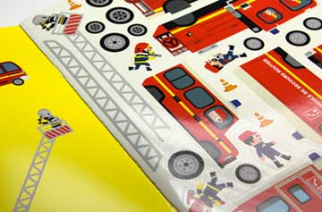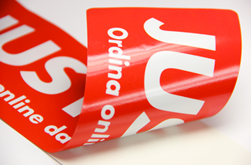Quadricromia e bianco coprente con vernice UV su PVC adesivo; fustellatura a mezzotaglio -