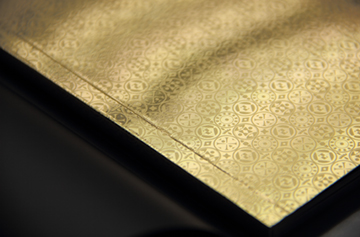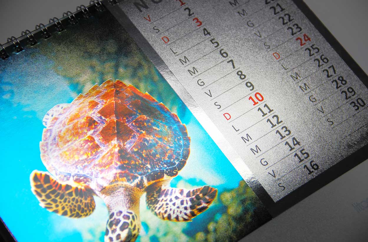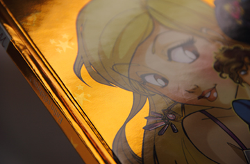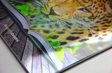 La stampa su carta laminata oro/argento o con disegni olografici consente di ottenere effetti metallici cangianti sulla superficie dello stampato. Tra la lamina e il colore è possibile aggiungere uno strato di bianco coprente, per ottenere tinte piene e compatte e far risaltare alcuni dettagli rispetto allo sfondo.