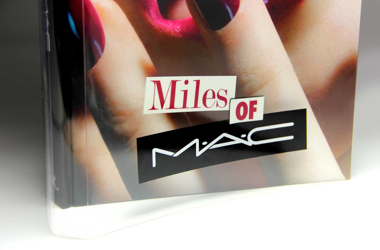 Quadricromia e bianco coprente con vernice UV su PVC adesivo; fustellatura a mezzotaglio -